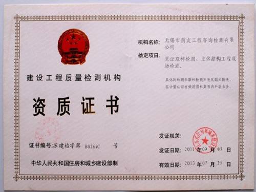 近日,從江蘇省住房和城鄉建設廳行政審批公告(蘇建審批公告(2011)第0154號文獲悉),無錫市前友工程咨詢檢測有限公司已順利通過建設工程檢測機構資質審查,核準資質的項目和類別包括:見證取樣檢測A、主體結構工程現場專項檢測C、建筑節能工程專項檢測(備1)、室內環境備案類檢測(備3)、建筑水電備案類檢測(備6-1)、墻體材料備案檢測(備7)、飾面材料備案類檢測(備8)、防水材料備案類檢測(備9)、門窗備案類檢測(備10)。![]() | ||