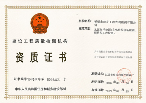 近日,無錫市前友工程咨詢檢測有限公司從江蘇省住房和城鄉建設廳行政服務中心領回了嶄新的《建設工程質量檢測機構資質證書》和《江蘇省建設工程質量檢測機構備案證書》。據此,公司資質延續工作已率先順利完成。 自2006年成立以來,公司在各級主管部門的領導和關心下,在廣大客戶的支持和配合下,在全體職工的不懈努力下,檢測能力逐步提高,至今,已具備了以下檢測資質能力項目: 見證取樣類:水泥物理力學性能;鋼筋(焊接連接)力學性能;砂、石常規;混凝土、砂漿強度;簡易土工;混凝土摻加劑(外加劑、粉煤灰);瀝青、瀝青混合料;預應力鋼絞線、錨夾具、金屬螺紋管。 專項檢測類:主體結構工程現場檢測(包括鋼筋保護層、現場強度檢測、結構性能、后置埋件力學檢測);鋼結構工程檢測(包括鋼結構工程用鋼材、連接件、鋼結構焊縫質量、防腐防火涂層、鋼結構變形);建筑節能檢測(建筑節能材料檢測、建筑節能現場檢測和熱工性能現場檢測)。 備案檢測類:室內環境檢測、建筑水電檢測、墻體、屋面材料、飾面材料、防水材料、門窗檢測。 安全檢測類:鋼管、扣件、承插型盤扣式鋼管支架檢測。 測繪類:工程測量、不動產測繪。 其它類:相零線檢測、 截面尺寸檢測(現澆樓板厚度檢測)、室內空間尺寸檢測、輕鋼龍骨、石膏板、鋁塑復合板檢測。
