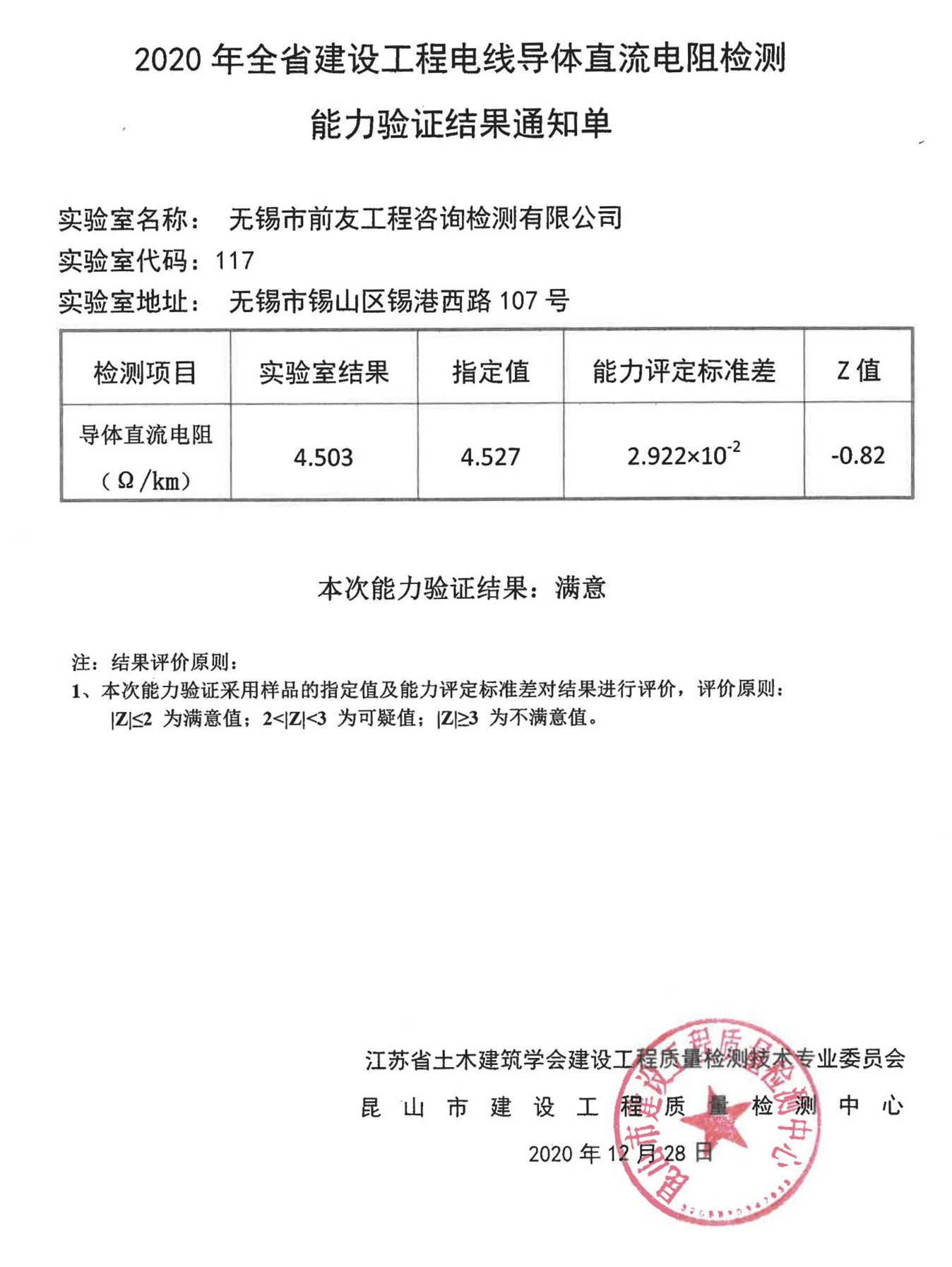 根據(jù)《省住房城鄉(xiāng)建設廳關于做好2020年全省建設工程質量檢測能力驗證工作的通知》文件要求,江蘇省土木建筑學會建設工程質量檢測技術專業(yè)委員會委托昆山市建設工程質量檢測中心組織開展了2020年全省電線導體直流電阻檢測能力驗證。2020年12月31日,發(fā)布了能力驗證結果。 近日,公司收到2020年全省電線導體直流電阻檢測能力驗證結果通知單與能力驗證結果滿意證書。
